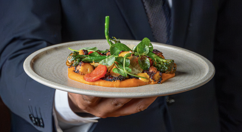 Pulpo en salsa de ají, cremoso de papa acompañado